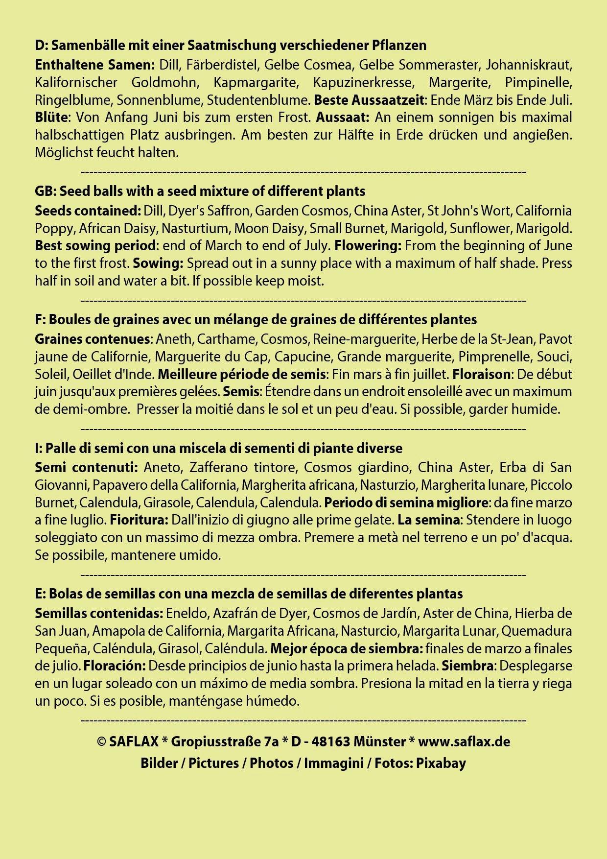 Samenbälle mit einer Saatmischung verschiedener Pflanzen Beste Aussaatzeit: Ende März bis Ende Juli. Blüte: Von Anfang Juni bis zum ersten Frost. Aussaat: An einem sonnigen bis maximal halbschattigen Platz ausbringen. Am besten zur Hälfte in Erde drücken und angießen. Möglichst feucht halten.