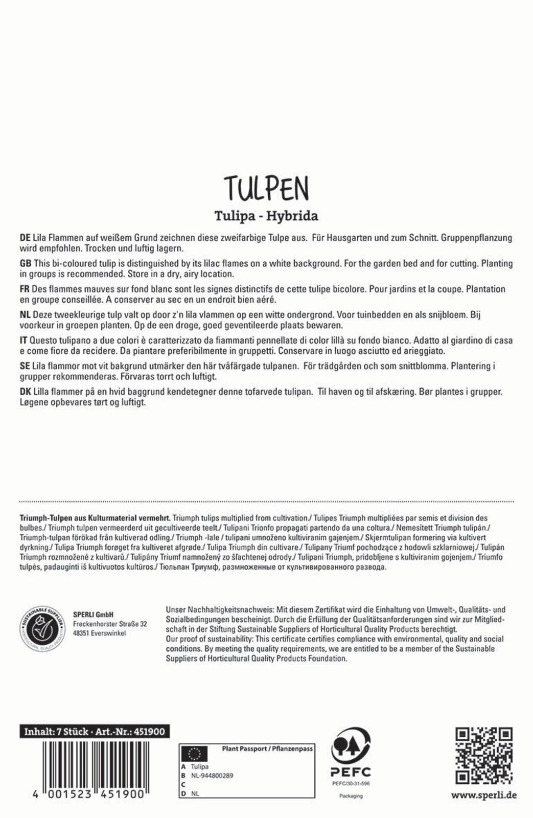 Lila Flammen auf weißem Grund zeichnen diese zweifarbige Tulpe aus. Für Hausgarten und zum Schnitt. Gruppenpflanzung wird empfohlen.Trocken und luftig lagern.