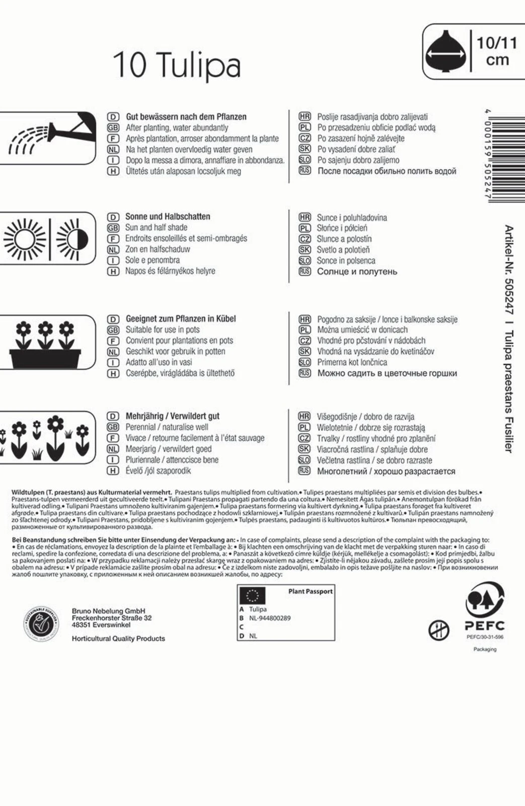 Die Wildtulpe ‚praestans Fusilier‘ besitzt orange-scharlachrote, feine Blüten und wächst ca. 20 cm hoch. Besonders an dieser mehrblütigen Pflanze ist, dass sie nicht nur in Kübeln kultiviert werden kann, sondern sich auch ausgezeichnet im Garten verwildern lässt. Somit können Sie sich über mehrere Jahre hinweg an den wunderschönen Blüten erfreuen, denn die Tulpe ist auch winterhart. Wenn Sie Ihre Blumenzwiebeln in Gefäßen pflanzen möchten, sollten Sie das Pflanzgefäß nach dem Setzen der Zwiebeln gut angießen und korrekt überwintern. Das ist z.B. möglich an der Hauswand, in der kalten Garage oder unter Sträuchern im Garten. Die Zwiebeln benötigen zwingend eine Kühlphase, um blühfähige Blüten zu entwickeln. Nur bei Frösten unter -10° C sollte zusätzlicher Winterschutz gegeben werden. Zwischen Mitte und Ende März können Sie die Gefäße aus dem Winterquartier holen und ins volle Licht stellen.